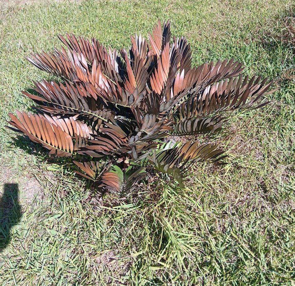 Plant: Cardboard palm. Finish: Brushed copper applied by frostbite on the frond extremities.
